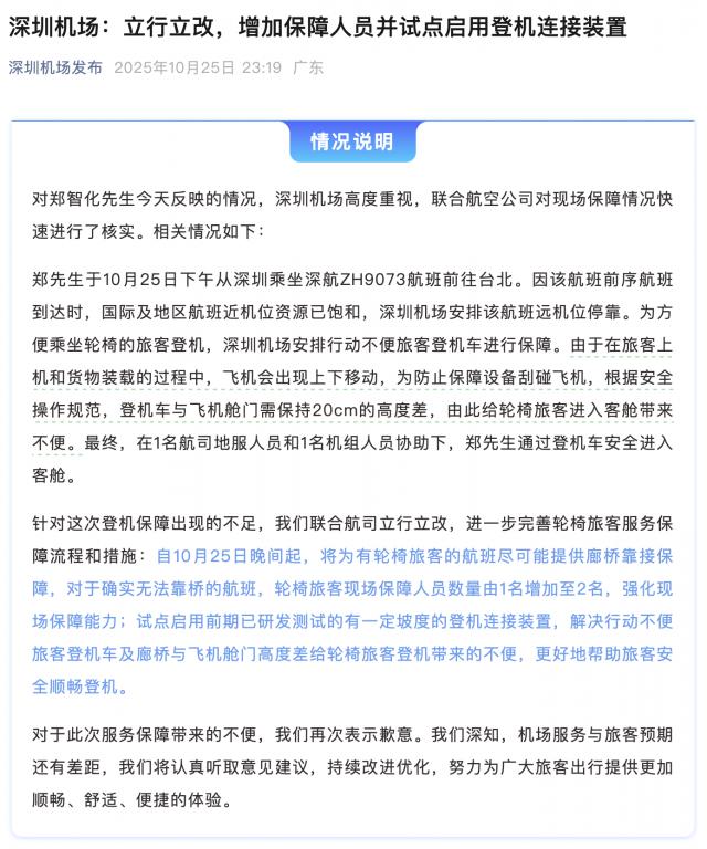 对此,深圳机场官方微博在郑智化微博下评论区表达了歉意,表示已第一时间会同航空公司启动核查,并将以此为契机,全面审视并优化对特殊旅客的服务保障细节。紧接着,深圳机场又在 25 日晚间发布了正式的情况说明,并推出了相应的整改举措。