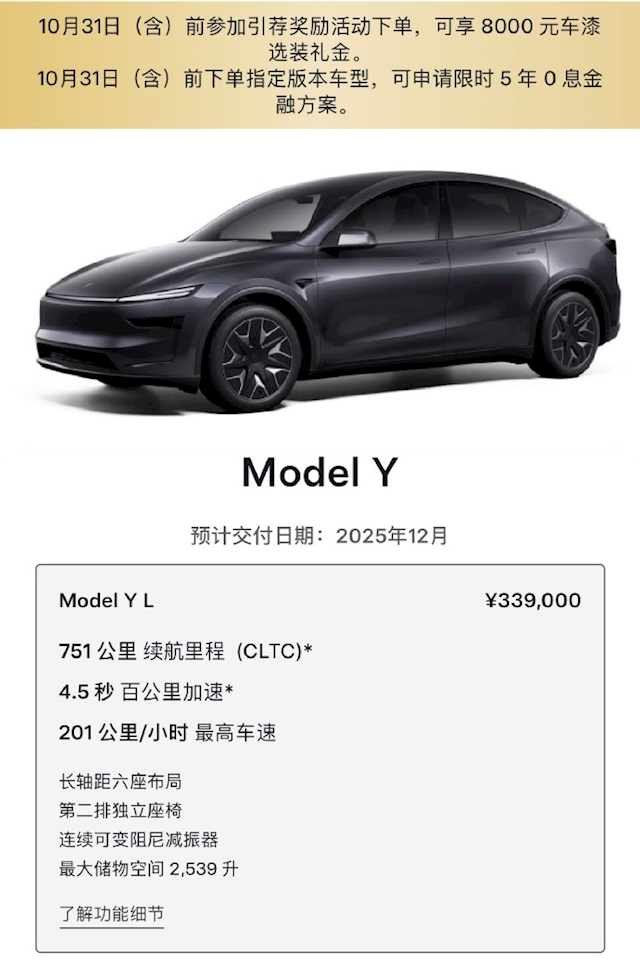 作为特斯拉专为中国市场打造的旗舰六座SUV,Model Y L于今年8月19日正式上市,售价33.9万元起。