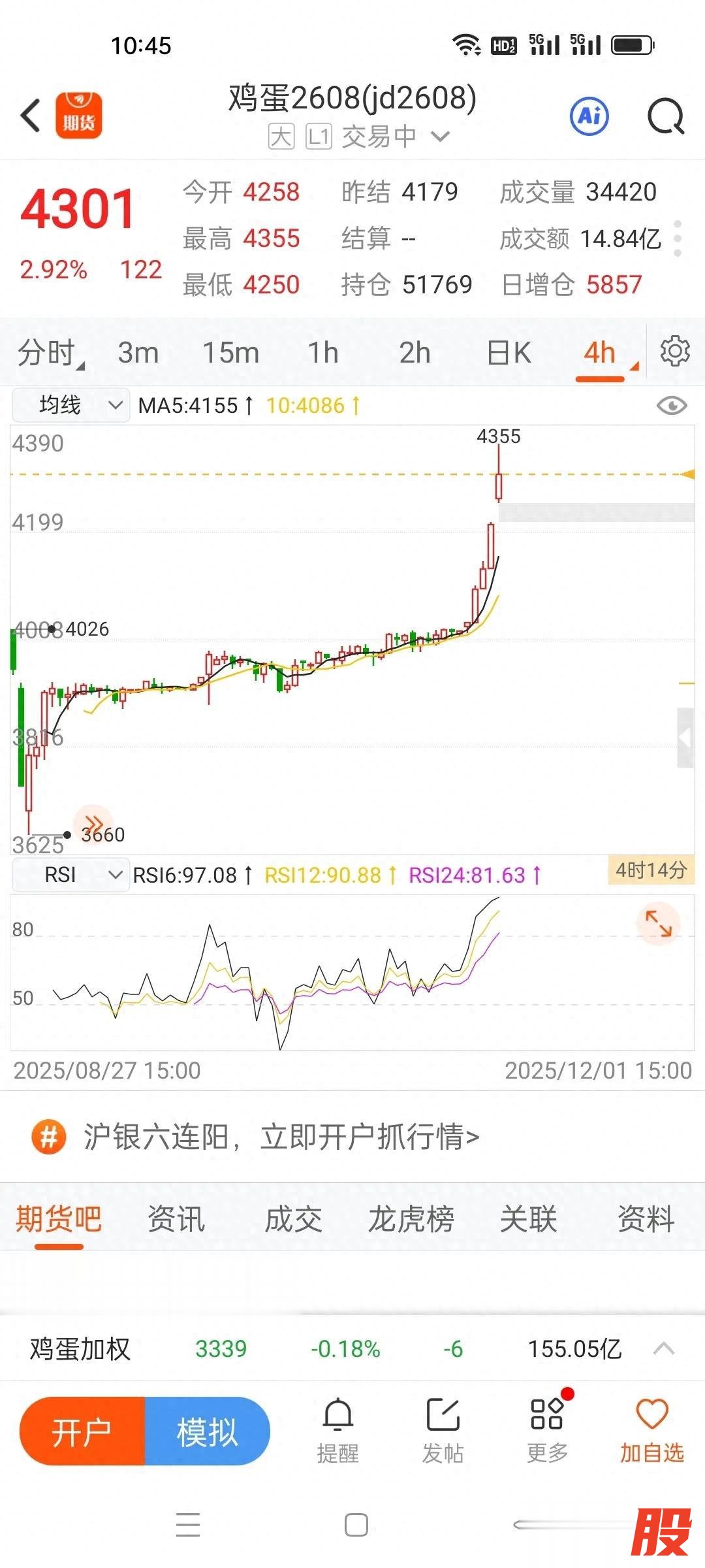 鸡蛋期货把2512打下去跌5.73%,盘中把鸡蛋2608合约拉升超3%,期价从4302到2782的巨大价差。笑傲江湖。